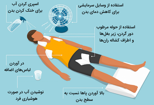 1. شخص را از مکان گرم به مکانی سایه‌دار یا دارای تهویه مطبوع منتقل کنید.