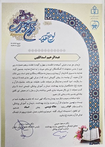 کسب مقام دوم کشوری بیست و نهمین جشنواره قرآن و عترت در رشته مقاله نویسی در بخش استاد با عنوان مقاله «ارزیابی میزان مطابقت حرم مطهر حضرت شاهچراغ (ع) با شاخص های شهر دوستدار سالمند» را به جنابعالی تبریک و تهنیت عرض می نمائیم و امیدواریم با علم و عمل، همواره پرچم دار فرهنگ نورانی قرآن و عترت (ع) باشید.