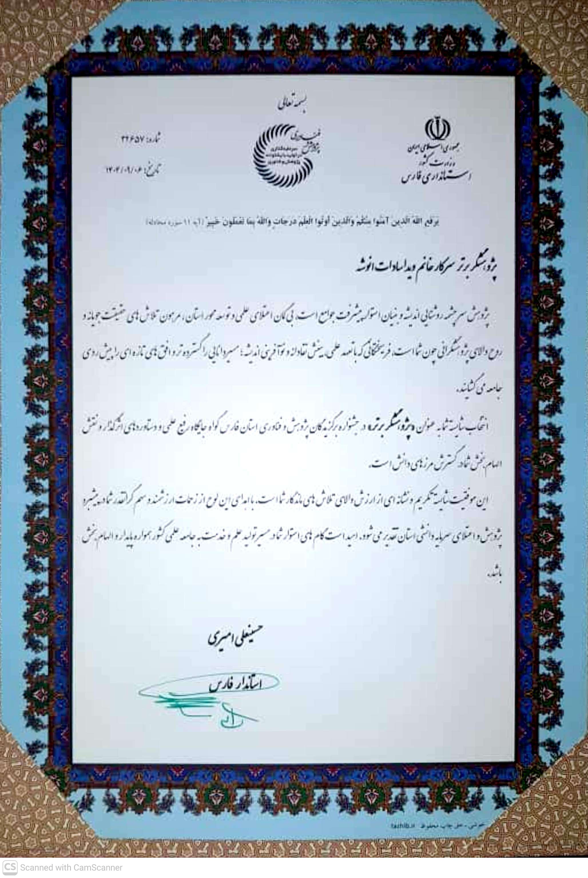 آقای دکتر علیرضا چوبینه به عنوان "پژوهشگر برتر" در جشنواره برگزیدگان پژوهش و فناوری استان فارس برگزیده شد.